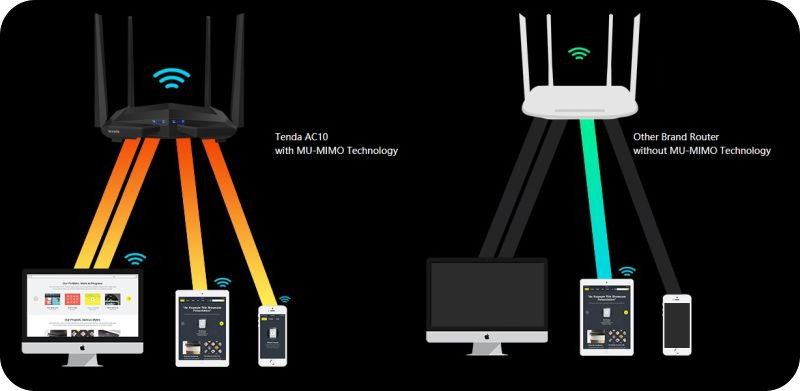 Dzięki technologii MU-MIMO, Router Tenda AC10 może komunikować się z wieloma urządzeniami naraz, skracając czas oczekiwania na transmisję. To istotna zmiana w porównaniu do poprzednich standardów bezprzewodowych, gdzie w danej chwili router mógł prowadzić transmisję tylko z jednym urządzeniem.