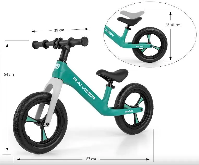 Wytrzymałe i wykonane w najnowszej technologii pianki EVA nieprzebijalne 12 koła, których nie trzeba pompować sprawia że są one bezobsługowe. Ergonomiczne z regulowaną wysokością siodełko z miękkim wypełnieniem zapewnia dziecku komfort jazdy oraz rośnie wraz z dzieckiem. Rowerek Ranger posiada łożyskowaną kierownicę oraz łożyskowane koła. Antypoślizgowe, miękkie gumowe rączki zapewniają pewny chwyt i wygodne prowadzenie.