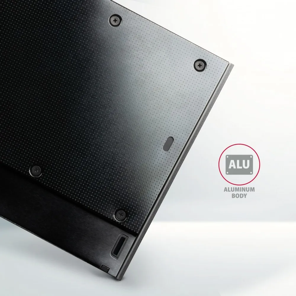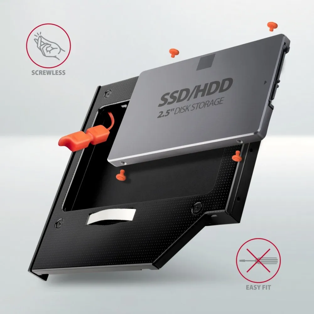 Wyjątkowy bezśrubowy system mocowania dysku jest zabezpieczony gumową przekładką lub gumowymi zatyczkami gwintowanymi. Gumowe zaślepki pomagają również zminimalizować wibracje dysku twardego. Metalowe sprężyny pomagają zamocować adapter we wnęce napędu optycznego. Metalowy korpus ramy wykonany jest z aluminium i zapewnia doskonałą ochronę mechaniczną dysku twardego. Wbudowany kondensator HQ pomaga ustabilizować zasilanie SSD/HDD. Elegancka wbudowana dioda LED sygnalizuje włożenie dysku i transfer danych.
