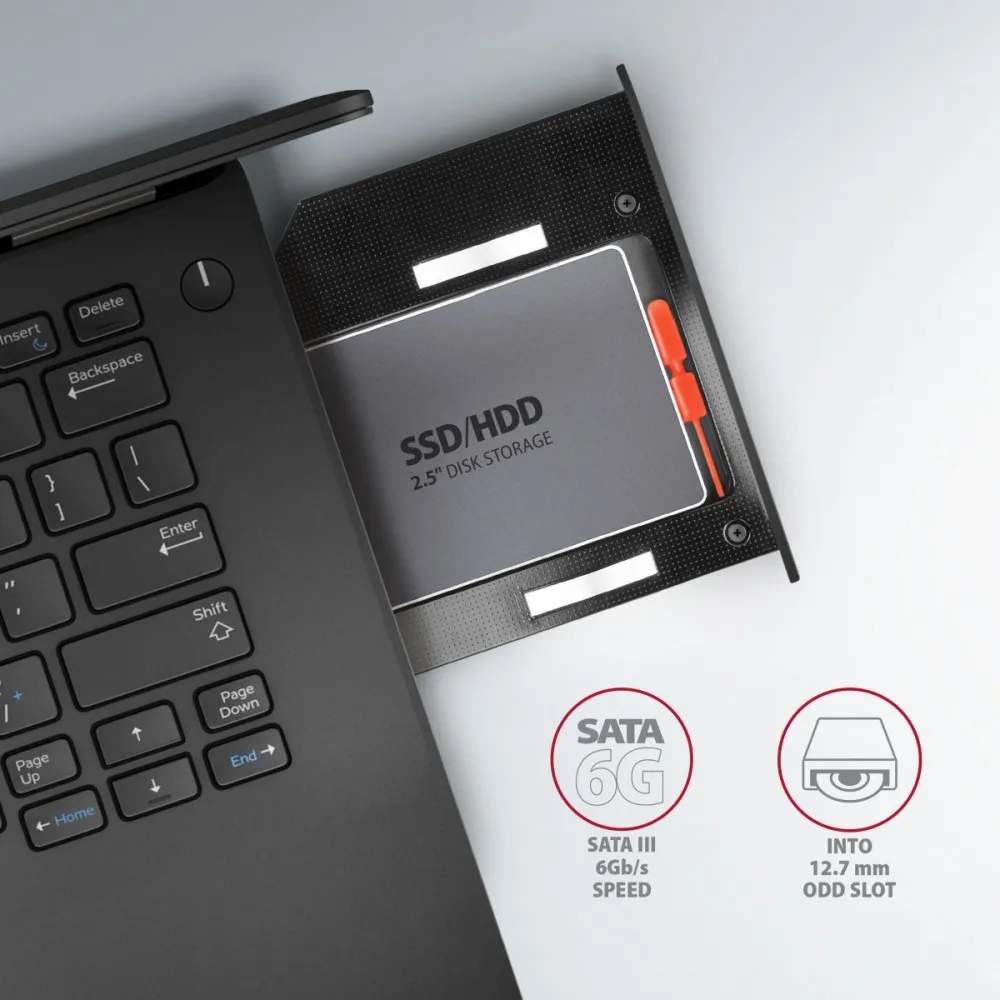 Możliwe zastosowanie standardowych dysków SSD 2.5 o wysokości 7 mm oraz dysków twardych o wysokości 12.5 mm. Kieszeń ODD z zamontowanym dyskiem pokazuje się jak standardowy dysk twardy w systemie operacyjnym oraz w BIOSie (UEFI). Wkładając dysk do adaptera, możesz łatwo dodać wewnętrzny dysk 2.5", który można wykorzystać do wsparcia istniejącego dysku notebooka. Obsługa rozruchu może znacznie przyspieszyć działanie starszych notebooków poprzez dodanie 2.5" dysku SSD.
