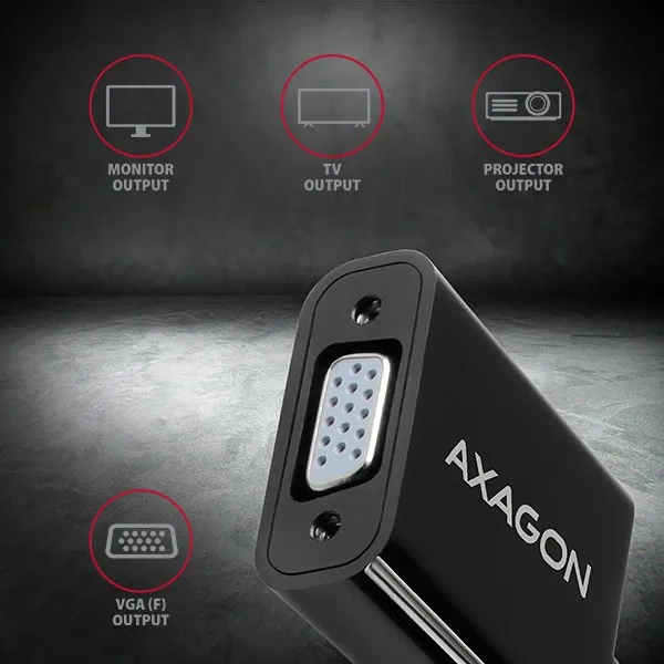 Aktywny adapter HDMI -> VGA AXAGON RVH-VGN do podłączenia starszego monitora VGA / telewizora / projektora do komputera lub innego urządzenia z wyjściem HDMI. Można go również używać z przystawkami STB lub konsolami Xbox i PlayStation.