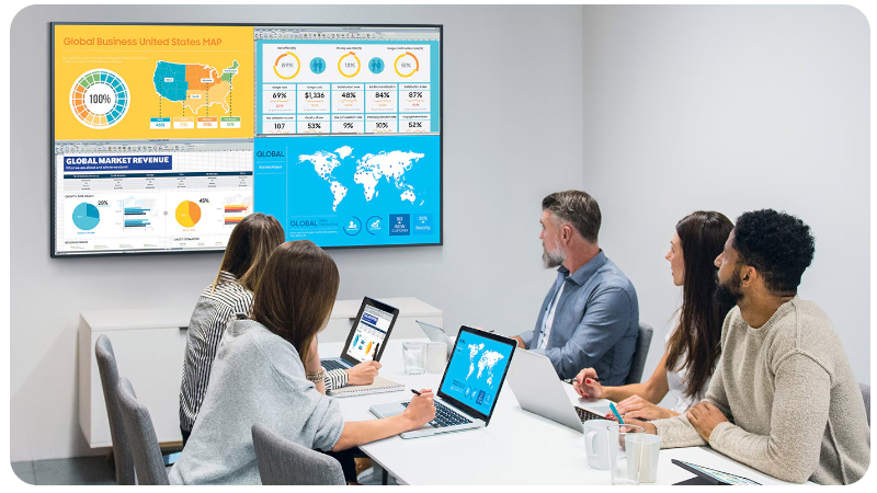 SmartView+ umożliwia bezprzewodowe udostępnianie ekranu bez połączeń kablowych, zapewniając łatwą współpracę. Użytkownicy mogą teraz włączyć funkcję udostępniania ekranu na początku spotkania, umożliwiając administratorowi spotkania szybkie przełączanie się między ekranami za pomocą jednego kliknięcia. Zagwarantuj pełną spójność marki na każdym wyświetlaczu w każdej lokalizacji. Korzystając z aplikacji mobilnej Samsung, Smart Calibration zapewnia odpowiednią kalibrację każdego wyświetlacza, prezentując logo marki i inne materiały w dokładnie wymaganych kolorach.