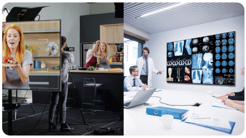 Wbudowane tryby profesjonalne dają więcej możliwości w określonych branżach. Tryb reżyserski minimalizuje przetwarzanie końcowe, dostosowując treść do pierwotnego zamiaru reżysera. Zespoły medyczne mogą oglądać obrazy medyczne, takie jak zdjęcia rentgenowskie, w trybie symulacji, w skali szarości zgodnej ze standardem DICOM. Samsung VXT CMS to oparte na chmurze rozwiązanie, które łączy funkcje zarządzania treścią i zdalnego zarządzania urządzeniami, umożliwiając użytkownikom zdalne zarządzanie ustawieniami sprzętu i rozwiązywanie problemów przy jednoczesnym łatwym tworzeniu i wdrażaniu treści bez konieczności wcześniejszego szkolenia.