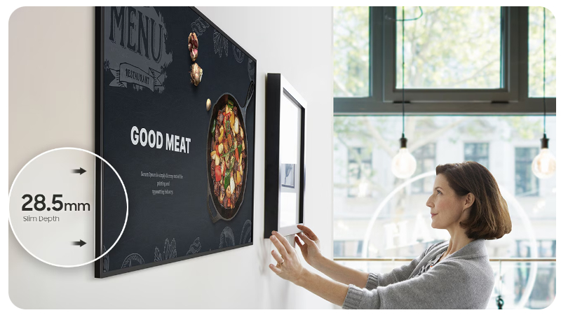 Niezrównana, ultracienka grubość 28,5 mm sprawia, że QMC jest najcieńszą opcją w serii UHD firmy Samsung. Wyświetlacz jest kompatybilny z uchwytem ściennym Slim Fit, który pozwala na łatwą i schludną instalację w dowolnym środowisku. QMC optymalizuje przestrzeń dzięki eleganckiemu designowi, który idealnie pasuje do Twojej firmy. Ramki są równomierne i jednolite ze wszystkich czterech stron wyświetlacza, o tej samej grubości i wymiarach. Nowa, równa konstrukcja ramek zapobiega powstawaniu jakichkolwiek problemów wizualnych, gdy wyświetlacz jest ustawiony w trybie portretowym.