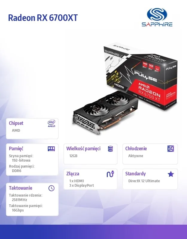 Komputery i podzespołyPodzespołyKarty graficzneSapphire Technology Karta graficzna Radeon RX 6700XT 12GB 192bit 11306-02-20G