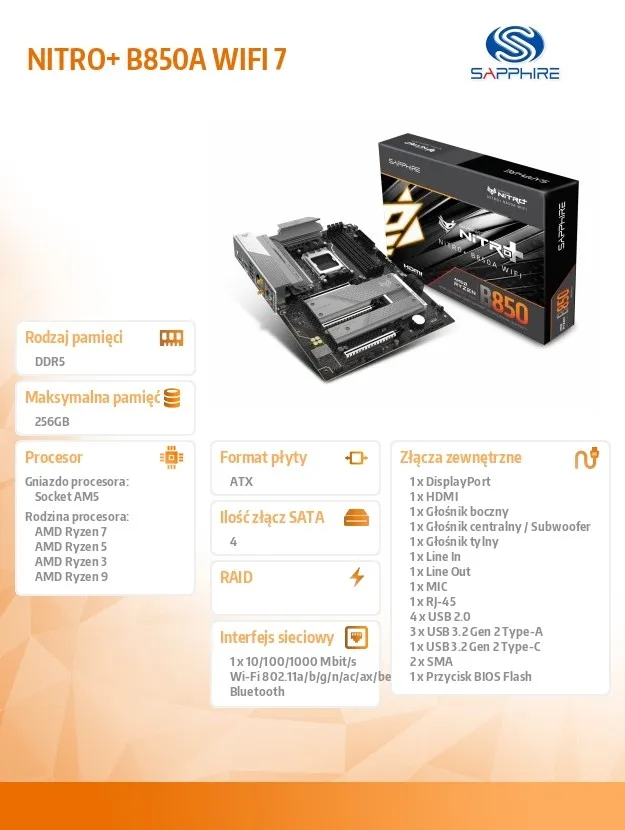 Komputery i podzespołyPodzespołyPłyty główneSapphire Technology Płyta główna NITRO+ B850A WIFI7 AM5 4DDR5 mATX