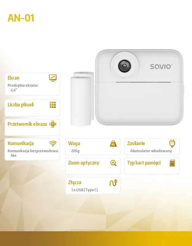 Aparat natychmiastowy Savio AN-01 to idealne połączenie zabawy i kreatywności. Pozwala nie tylko robić zdjęcia i nagrywać filmy, ale też natychmiast drukować fotografie na papierze termicznym, bez konieczności używania tuszu. Dzięki prostemu interfejsowi, kolorowemu ekranowi i wbudowanym grom, dzieci mogą rozwijać swoją wyobraźnię i cieszyć się tworzeniem wspomnień w każdych warunkach w domu, na wakacjach czy podczas rodzinnych spotkań.