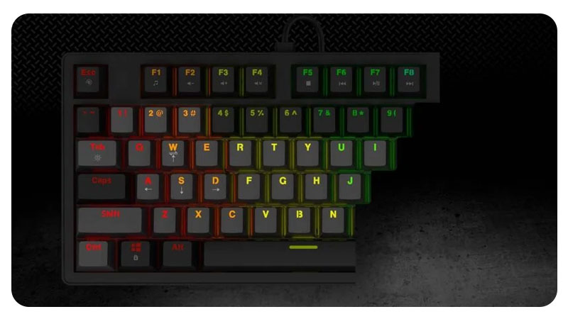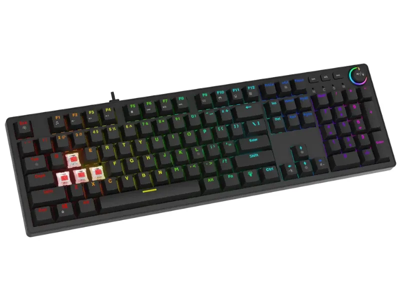 Klawiatura oferuje pełne podświetlenie RGB (Red, Green, Blue) z możliwością wyboru spośród aż 21 trybów. Od efektów statycznych po dynamiczne animacje – z łatwością dopasujesz styl podświetlenia do swojego nastroju, gry lub estetyki stanowiska. STYX to klawiatura full size z pełnym układem klawiszy, w tym blokiem numerycznym i dodatkowymi klawiszami multimedialnymi. Dzięki temu zyskujesz maksymalną funkcjonalność, niezależnie od tego, czy grasz, pracujesz czy edytujesz multimedia. Dodatkowym atutem jest wielofunkcyjne pokrętło, które pozwala regulować głośność i podświetlenie – bez potrzeby używania skrótów klawiszowych.