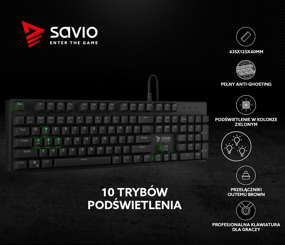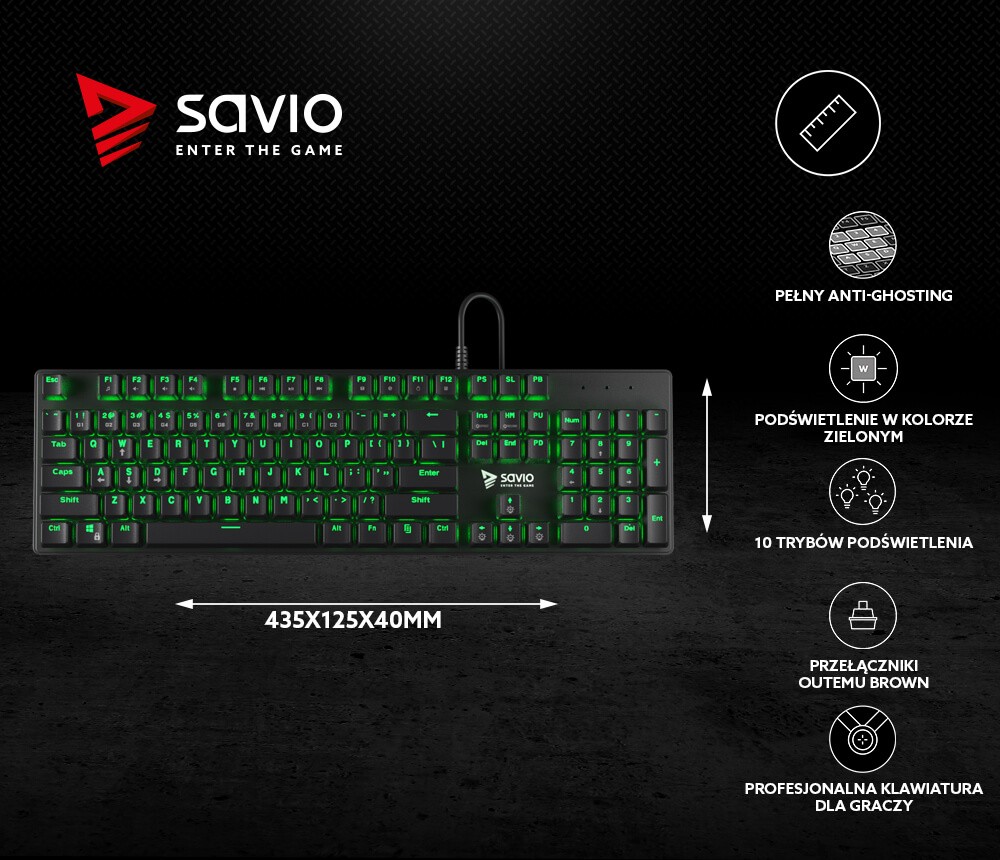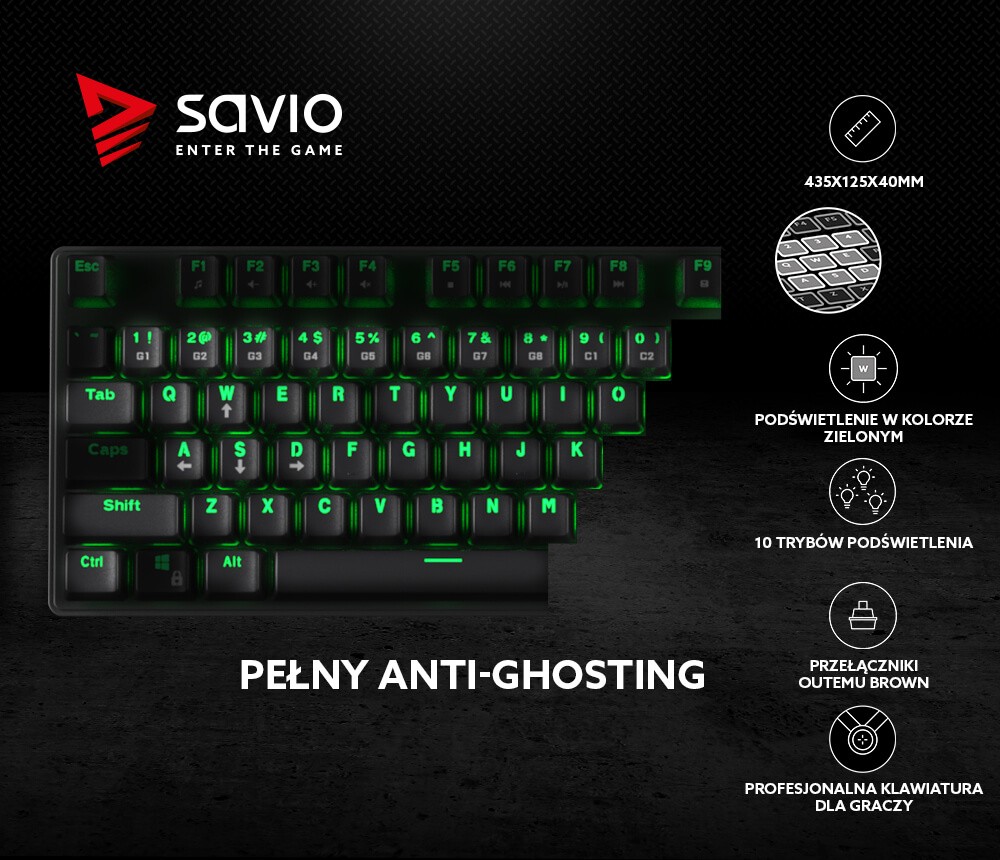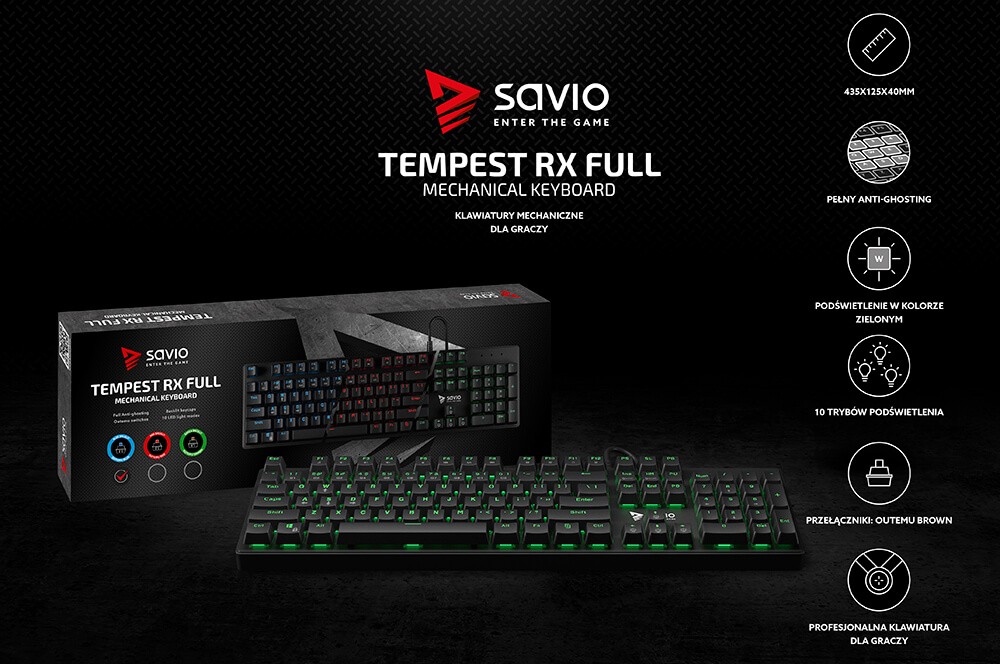 Klawiatura mechaniczna gamingowa Savio Tempest RX FULL Outemu Brown, podświetlenie LED zielone, NKRO, Anty-ghosting