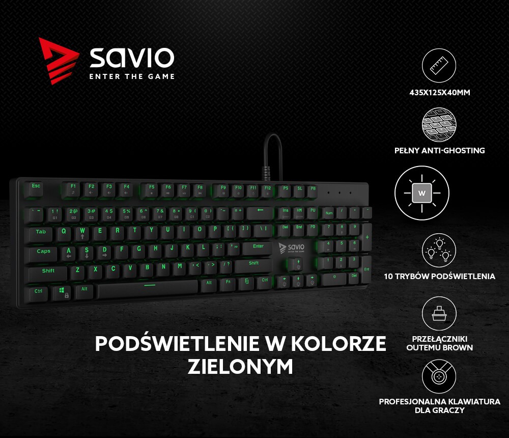 Klawiatura mechaniczna gamingowa Savio Tempest RX FULL Outemu Brown, podświetlenie LED zielone, NKRO, Anty-ghosting