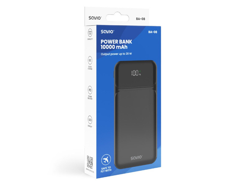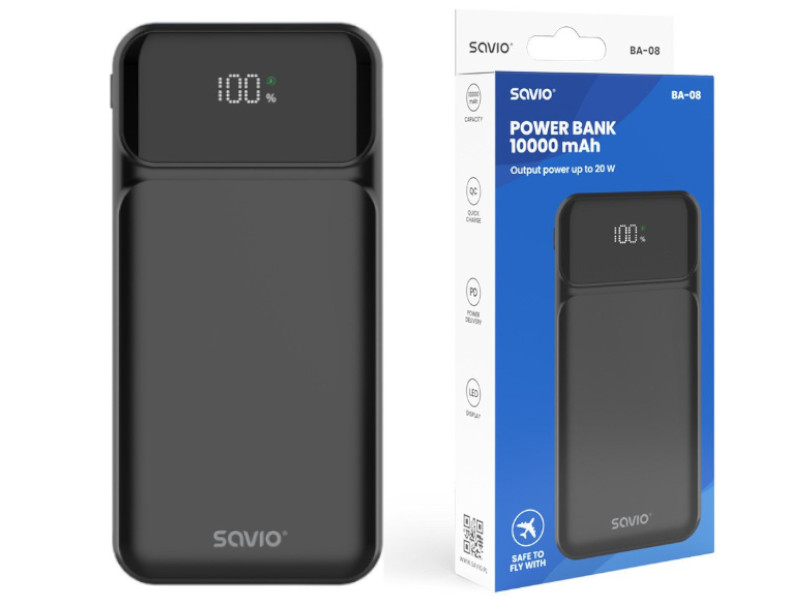 Power Bank został wyposażony w szereg zabezpieczeń, chroniących przed przeładowaniem, przegrzaniem, przeciążeniem, zwarciem oraz nadmiernym rozładowaniem. Dzięki temu możesz bez obaw korzystać z niego na co dzień, a jego konstrukcja spełnia normy bezpieczeństwa wymagane podczas podróży samolotem. Kompaktowa obudowa i smukły, lekki design (230 g, grubość 16,5 mm) sprawiają, że Savio BA-08 bez problemu zmieści się w kieszeni lub torbie. Nowoczesna, minimalistyczna forma czyni go nie tylko praktycznym, ale i eleganckim akcesorium.