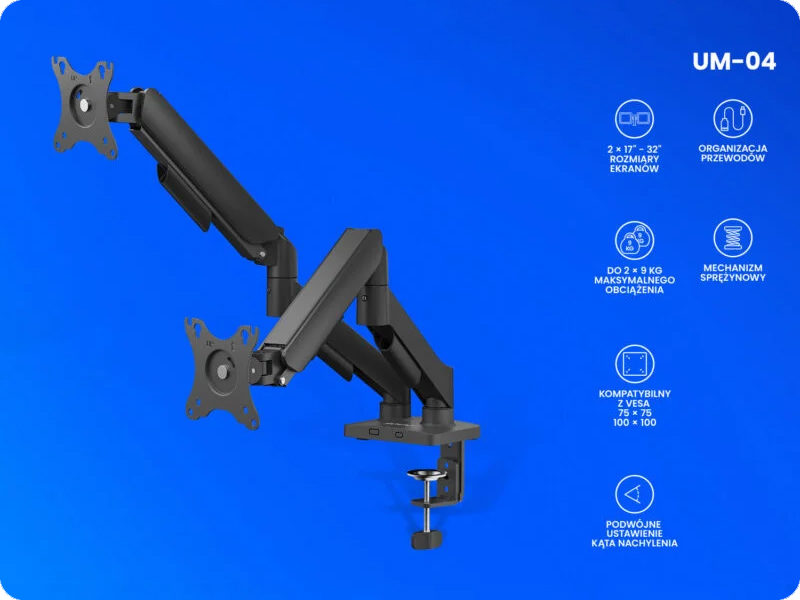 Podwójny uchwyt biurkowy UM-04 to idealne rozwiązanie dla osób korzystających z dwóch ekranów jednocześnie – niezależnie od tego, czy pracujesz, projektujesz, czy grasz. Obsługuje monitory o przekątnej od 17 do 32 cali i wadze do 9 kg na każde ramię, zapewniając stabilność i bezpieczeństwo. Mechanizm sprężynowy umożliwia błyskawiczną i bezwysiłkową regulację pozycji ekranów bez użycia narzędzi. To sposób na uporządkowaną, funkcjonalną i nowoczesną przestrzeń roboczą.