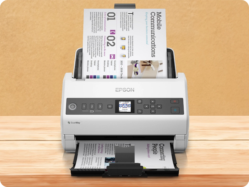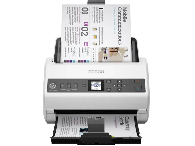 Epson WorkForce DS-730N oferuje interfejsy USB, LAN oraz WiFi, dzięki czemu łatwo dopasuje się do istniejącej infrastruktury biurowej. Wbudowany wyświetlacz ułatwia obsługę i szybki dostęp do funkcji skanowania. Urządzenie umożliwia skanowanie bezpośrednio do e-maila oraz na serwer FTP. Obsługa wielu formatów plików, takich jak PDF, JPEG, TIFF, PNG, DOC czy XLS, zwiększa jego uniwersalność. Funkcja pomijania pustych stron dodatkowo optymalizuje proces digitalizacji dokumentów.