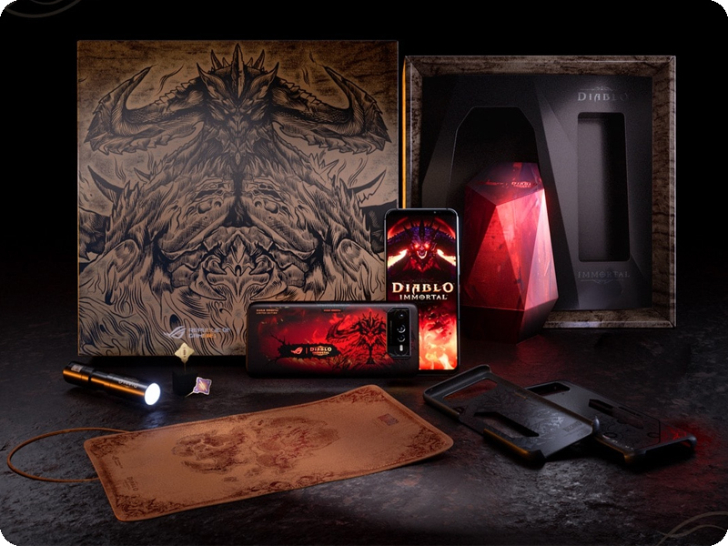 Smartfon ROG Phone 6 Diablo Immortal Edition jest dostarczany wraz z osłoną Błogosławiona Tarcza Aero Case i mapą Sanktuarium z ukrytymi znakami naniesionymi niewidzialnym atramentem, które można zobaczyć za pomocą Światła Fahira. Ponadto w zestawie jest wyróżniający się unikalnym wykończeniem Immortality pin do wyjmowania karty SIM - wzorowany na logo gry. Wszystkie akcesoria są integralną częścią świata inspirowanego grą Diablo.