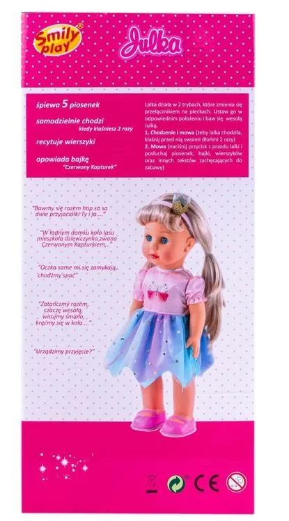 LALKA CHODZĄCA JULKA MÓWI, ŚPIEWA, OPOWIADA BAJKĘ Lalka Julka mówi po Polsku! Lalka działa w 2 trybach, które zmienia się przełącznikiem na pleckach. Ustaw go w odpowiednim miejscu i baw sie wesołą Julką.