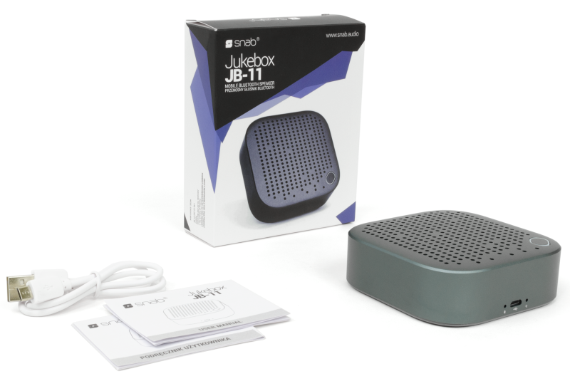 Snab Jukebox JB-11 to przenośny, działający w najnowszym standardzie Bluetooth 4.2 głośnik, który pozwala cieszyć się wyjątkową jakością i głośnością dźwięku. Mimo niemal kieszonkowej, wykonanej z aluminium lekkiej obudowy Jukebox JB-11 może bez podłączenia do zasilania odtwarzać muzykę przez 5 godzin lub obsługiwać połączenia głosowe przez 10 godzin.