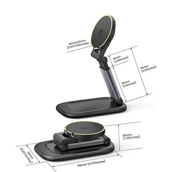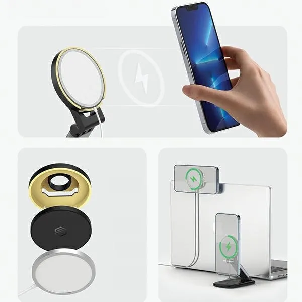 SODI BM 310 Magnetyczny stojak na telefony iPhone serii 15/14/13/12, kompatybilny z ładowarką indukcyjną Apple MagSafe. Stojak z uchwytem na kamerę, składany i regulowany. Uchwyt ze złączem magnetycznym na telefon po wyjęciu z podstawy możliwy do zamocowania bezpośrednio na obudowie laptopa.