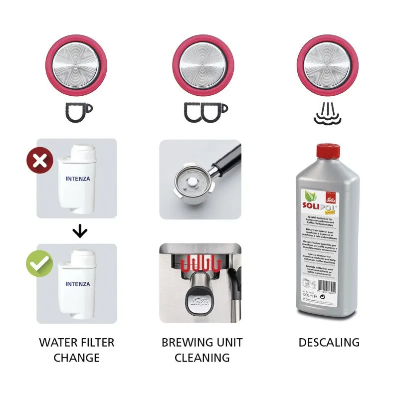 Przypomina o wymianie filtra wody, odkamienianiu i czyszczeniu jednostki zaparzającej. Obejmuje automatyczne programy czyszczenia. - Wkłady filtracyjne 54 mm