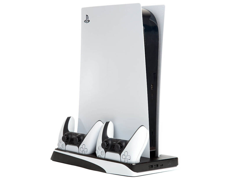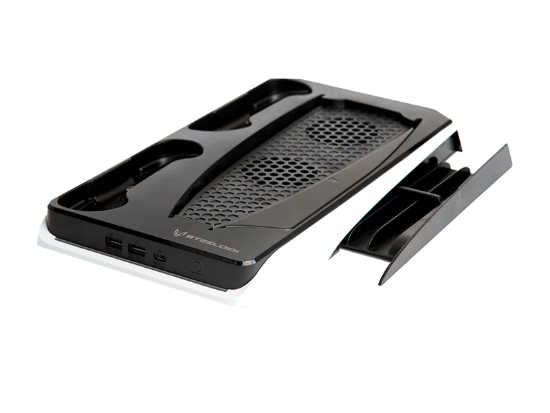 Wielofunkcyjna podstawka do konsoli PS5 posiada 2 wentylatory, które skutecznie doprowadzają chłodne powietrze do urządzenia. Ponadto dwa porty USB-C przeznaczone są do ładowania padów DualSense do konsoli PlayStation 5. Minimalistyczna kolorystyka jest zgodna z konsolą i padami, tworząc spójny, estetyczny zestaw.