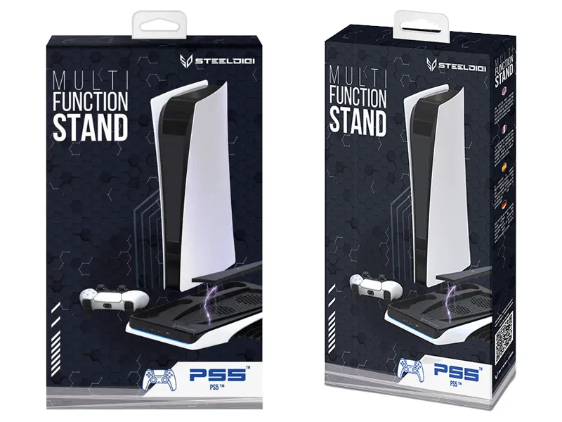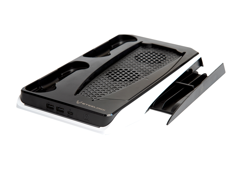Kompaktowa podstawka SteelDigi MultiFunction Stand posiada wbudowaną, wysuwaną półkę z przegrodami na 12 pudełek z płytami. Dodatkowo pod spodem podstawki znajduje się specjalne miejsce na dołączony do zestawu kabel z 2 złączami USB-C o długości ok. 25 cm, służący do podłączenia stacji dokującej do konsoli. Złożona podstawka zajmuje niewiele miejsca i posiada jedynie 32 mm wysokości. Multifunkcyjna stacja od SteelDigi posiada nowoczesny, biało-czarny design z kolorowym podświetleniem LED, dzięki czemu dobrze komponuje się z konsolą PS5 oraz kontrolerami.