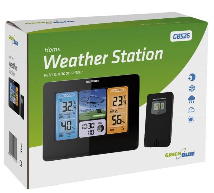 Nowoczesna stacja pogody z dużym, czytelnym wyświetlaczem. Niezawodna, elegancka i prosta w obsłudze stacja pogodowa GB526! Bezprzewodowy czujnik temperatury zewnętrznej o zasięgu do 60 m. Wysoka jakość gwarantowana przez renomowanego producenta. Mnogość funkcji, duży czytelny kolorowy ekran wyświetla jednocześnie temperaturę, wilgotność, ciśnienie oraz graficzną prognozę pogody. Oprócz tego pokazuje aktualną godzinę, fazę księżyca oraz trendy zmiany temperatury, wilgotności oraz ciśnienia.