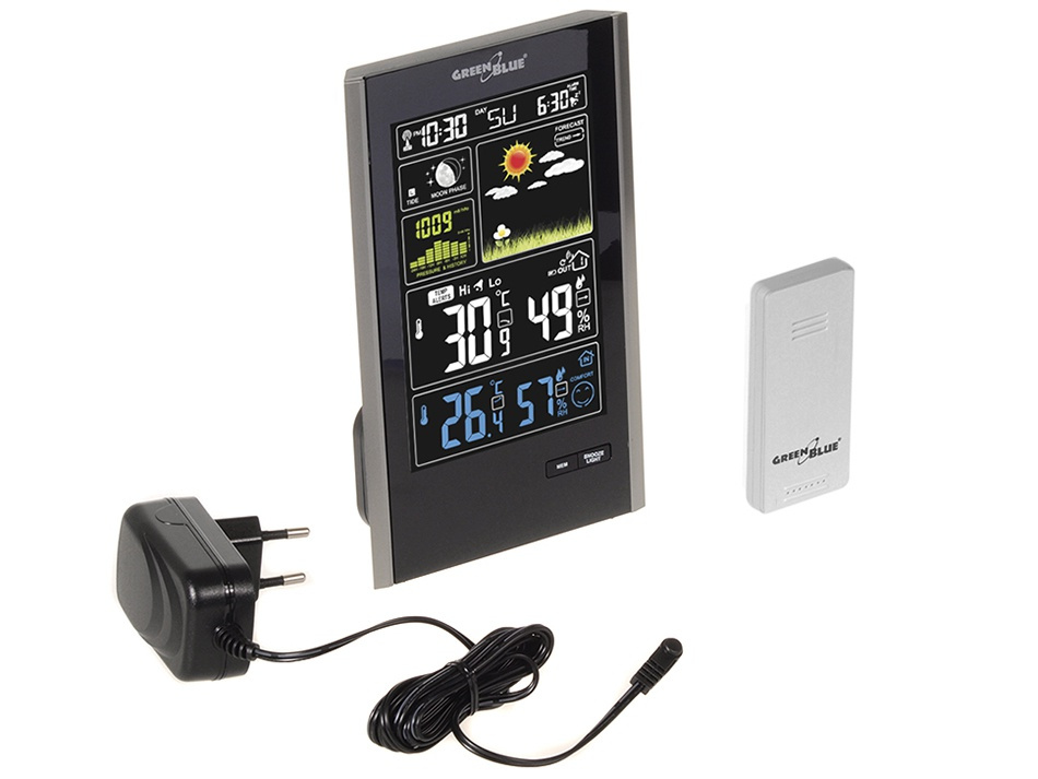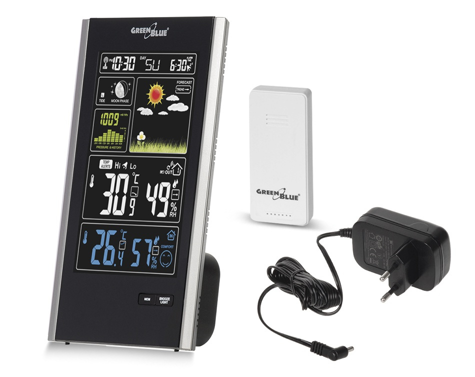 GreenBlue GB520 jest to stacja pogodowa, która posiada funkcje, które z pewnością zaspokoją Twoje potrzeby. Urządzenie posiada funkcję prognozowania pogody, wyświetlania faz księżyca i przypływów, funkcję ostrzegania przed zamarzaniem. Dzięki GreenBlue GB520 wskazywany czas będzie zawsze aktualny, ponieważ będzie synchronizowany za pomocą radiowego akutalizowania czasu.