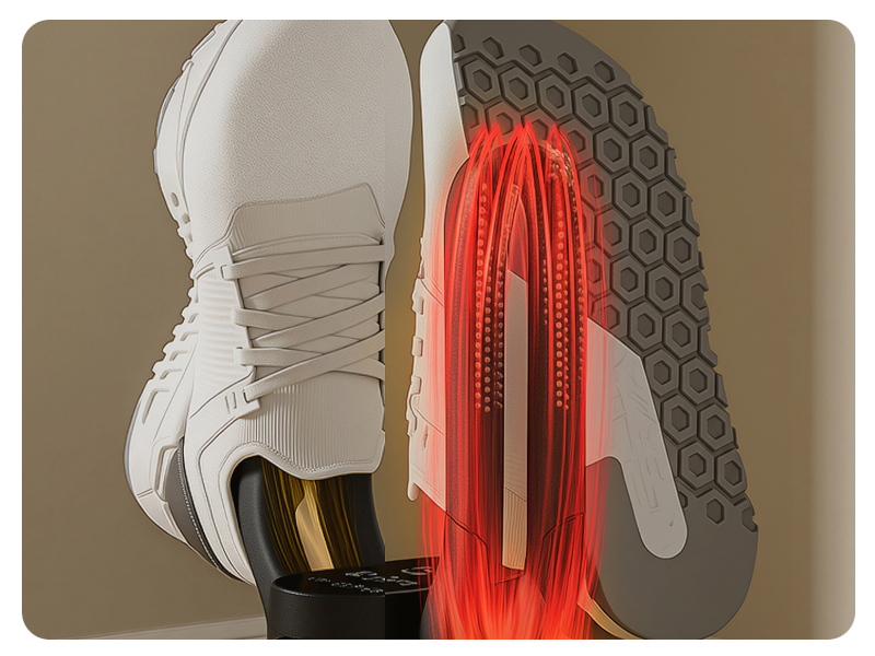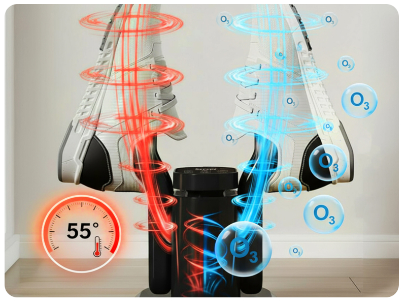 Nowoczesna suszarka została wyposażona w automatyczną regulację temperatury w zakresie 40–55 °C, dzięki czemu zapewnia skuteczne i bezpieczne suszenie obuwia z różnych materiałów — bez ryzyka przegrzania czy uszkodzeń. Inteligentne sterowanie chroni strukturę skóry i tkanin, zachowując ich trwałość i komfort noszenia. Dodatkowo wbudowany generator ozonu o wydajności do 50 mg/h skutecznie eliminuje bakterie, grzyby oraz nieprzyjemne zapachy, docierając do wnętrza obuwia i neutralizując źródło problemu. Efektem są świeże, higienicznie czyste buty, gotowe do ponownego użycia każdego dnia.