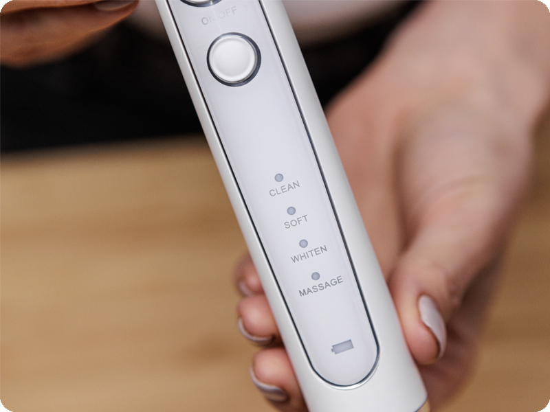 Diody LED sygnalizują wybrany tryb pracy oraz poziom naładowania baterii, zapewniając pełną kontrolę nad użytkowaniem. Ułatw sobie codzienną rutynę dzięki przejrzystym wskaźnikom. Sprawdź status szczoteczki jednym rzutem oka. Program czyszczenia trwa 2 minuty z 30-sekundowymi interwałami, co ułatwia równomierne czyszczenie całej jamy ustnej. Zapewnij sobie optymalny czas szczotkowania dla zdrowych zębów. Regularne przerwy pomagają dokładnie umyć wszystkie części jamy ustnej.