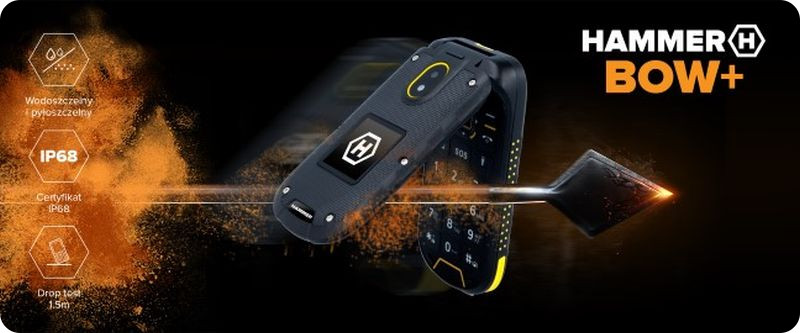 Błoto, deszcz, pył - to Twoja codzienność? Świetnie, bo Hammer BOW+ posiada certyfikat IP68*, który sprawi, że sprawdzi się nawet w najtrudniejszych warunkach. Obudowa jest bardziej odporna na wstrząsy i upadki (drop test 1,5 m), a zamknięcie ekranu pod klapką zapewnia mu dodatkową ochronę.