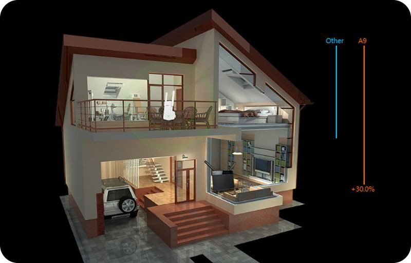 A9 rozsyła sygnał WiFi zarówno w poziomie jak i w pionie. W domach jednorodzinnych ściany nośne zawsze powodują spadek mocy sygnału na innych piętrach. Dzięki zoptymalizowanemu oprogramowaniu, sprzętowi oraz antenom A9 posiada o 30% większą moc niż porównywalne produkty. Przez co zapewnia pokrycie zasięgiem sieci WiFi wielopiętrowego domu.