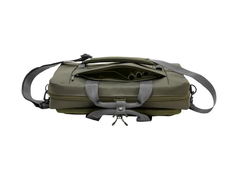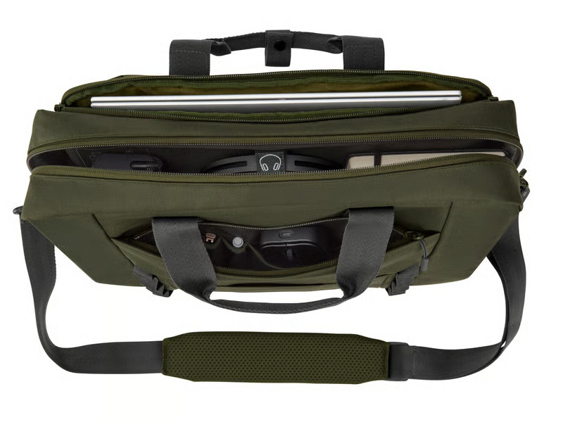 Torba wyposażona jest w dwie kieszenie zewnętrzne z przepustem na kable, dodatkowe przegródki w głównej komorze, kieszeń na butelkę oraz bezpieczne, zamykane zamki błyskawiczne. Wodoodporny poliester chroni zawartość przed niekorzystnymi warunkami atmosferycznymi, a wytrzymałe pierścienie D i solidne klamry zapewniają trwałość nawet przy intensywnym użytkowaniu. Model został wykonany w 51% z plastiku pochodzącego z recyklingu poużytkowego (PCR), co odpowiada 46 plastikowym butelkom. Dodatkowo opakowanie posiada certyfikat FSC®, podkreślając ekologiczny charakter produktu.