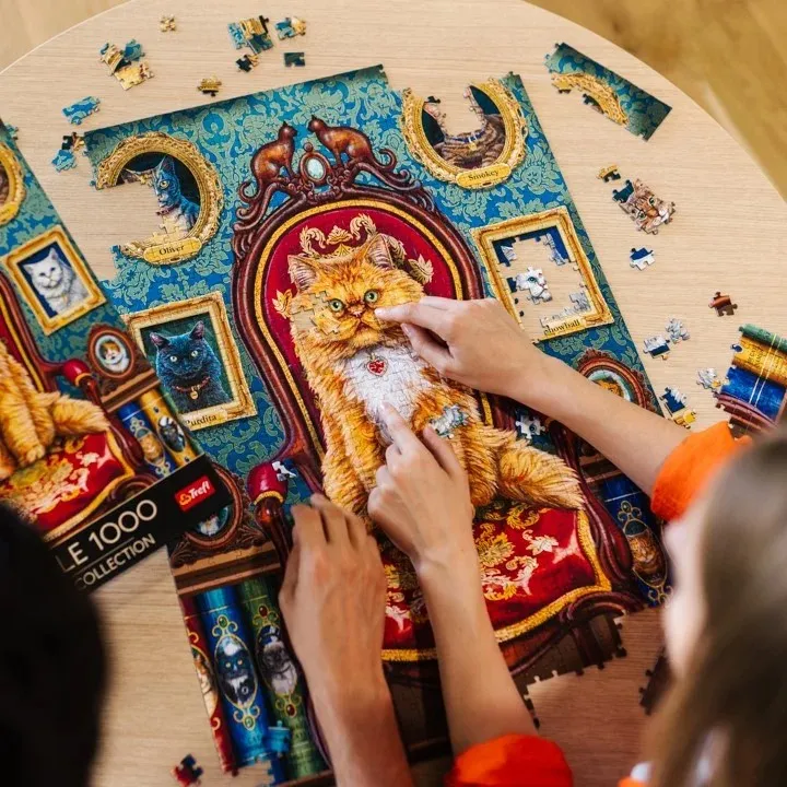 Puzzle Kotomania, przedstawiają dostojnego kota w otoczeniu kocich rodzinnych portretów. Po ich ułożeniu powstanie obraz o wymiarach 683x480 mm.