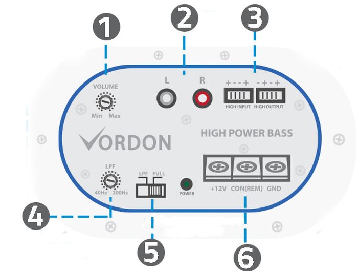 Każdy samochód posiada inną akustykę i rozmiary. Fale akustyczne z różnych głośników nakładają się na siebie, może to powodować dodawanie się lub znoszenie fal w zależności od miejsca w samochodzie i częstotliwości. Dlatego najlepsze umiejscowienie subwoofera należy dobrać metodą prób i błędów, prowadząc odsłuch z miejsca kierowcy. Wzmacniacz jest wyposażony w filtr dolnoprzepustowy LPF (low-pass filter), z płynną regulacją pokrętłem w zakresie 40Hz-200Hz, z możliwością jego wyłączenia (przełącznik w pozycji LPF FULL). Dzięki konstrukcji tuby i rozwiązaniu bass-reflex, bas pozostaje głęboki i czysty, nawet przy wysokim poziomie głośności. Przy pierwszym podłączeniu najlepiej ustawić potencjometr wzmacniacza w pozycji „min”, następnie powoli zwiększać głośność, aż do uzyskania mocy maksymalnej. Najmniejsze zniekształcenia uzyskuje się przy 80-90% mocy maksymalnej.