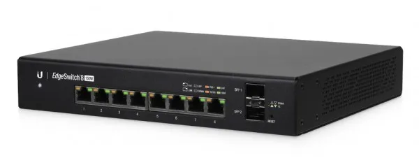 Kompaktowy EdgeSwitch ma wszechstronną konfigurację portów: osiem portów Gigabit Ethernet obsługujących PoE + i dwa porty SFP do połączeń światłowodowych. Można go umieścić na biurku lub zamontować na ścianie.
