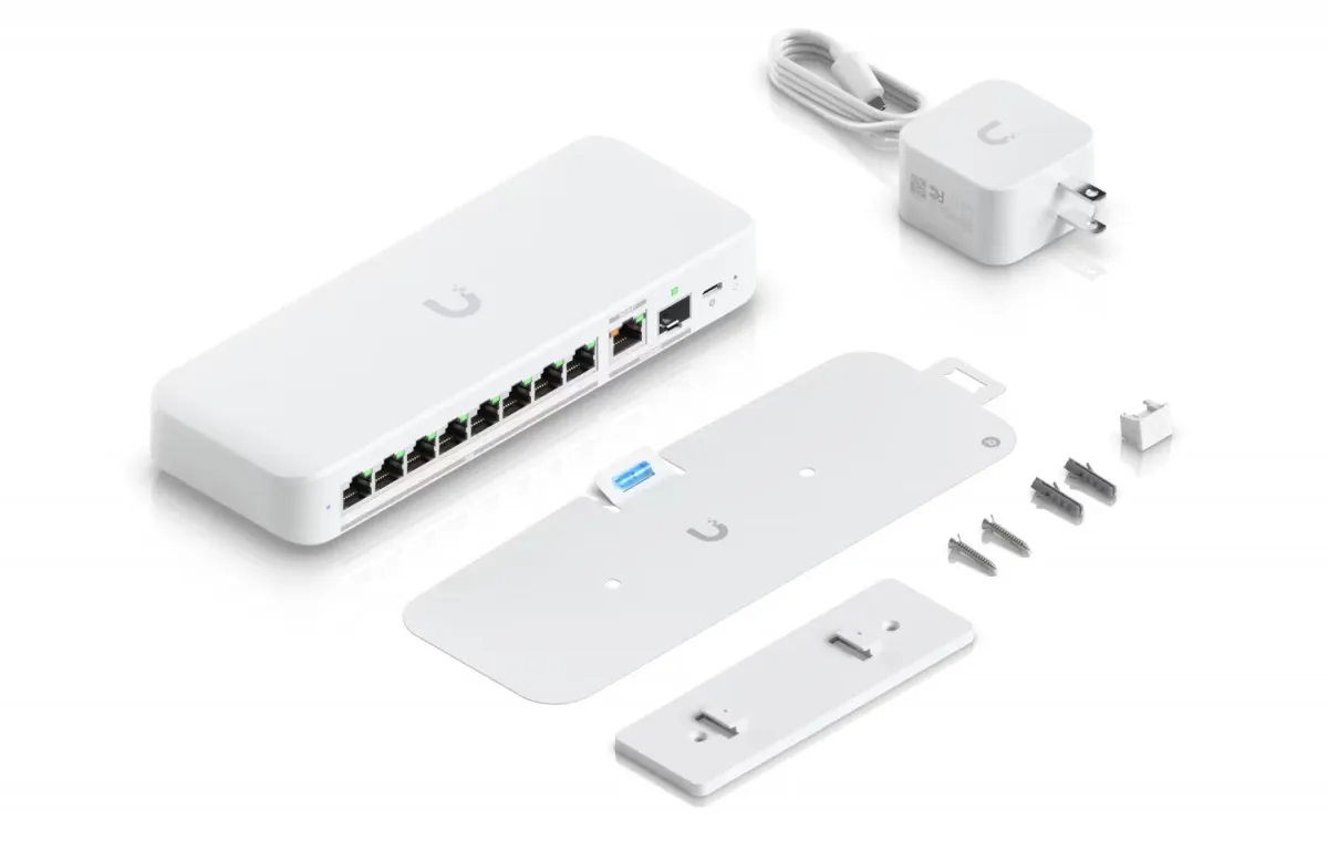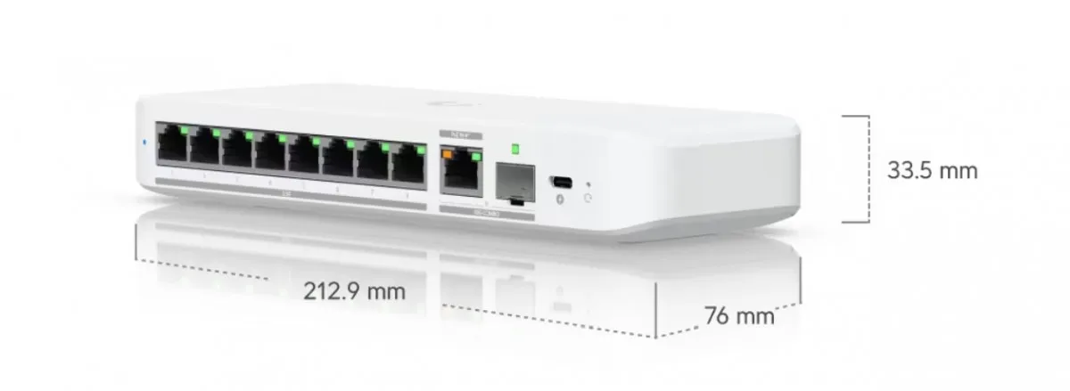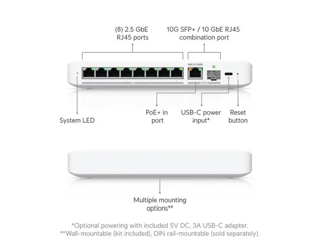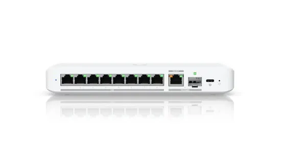 Elastyczny przełącznik 2,5 GbE z 8 portami i 10-gigabitowym portem uplink RJ45/SFP+, który można zasilać za pomocą adaptera USB-C lub PoE+.