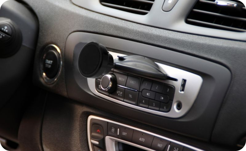Samochodowy uchwyt magnetyczny do urządzeń mobilnych. Montaż w szczelinie odtwarzacza CD gwarantuje idealne umiejscowienie w samochodzie, ponadto uchwyt nie wysunie się nawet podczas terenowej jazdy. Bardzo szybki sposób montażu – bezpieczny dla odtwarzacza i znajdującej się w nim płyty. Można po instalacji słuchać muzyki z umieszczonym w odtwarzaczu płyty.Silny magnes pewnie utrzymujący telefon nawet przez grube etui. Głowica 360 stopni blokowana nakrętką aby telefon był w pożądanej pozycji.