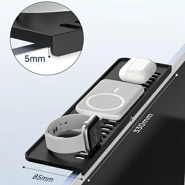- Zarządzanie kablami: Specjalne wycięcia w tylnej części umożliwiają estetyczne i wygodne przeprowadzenie kabli do ładowania smartfonów, słuchawek czy zegarków.