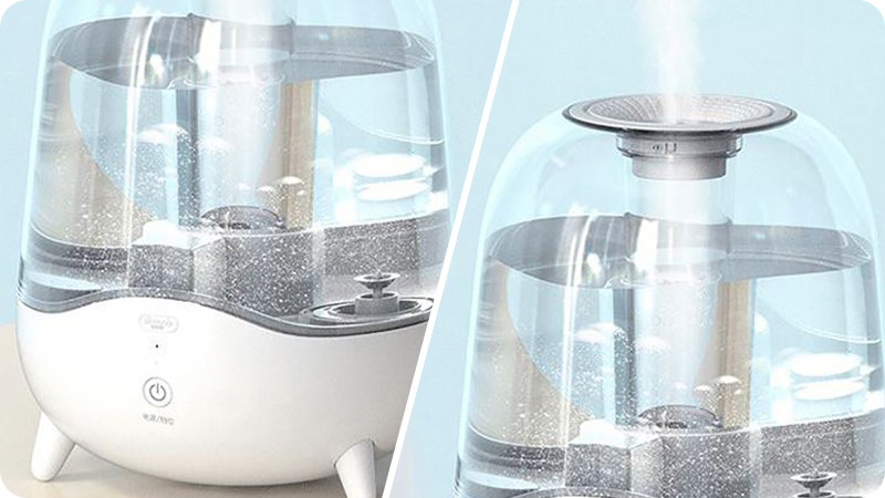 Zbiornik o pojemności 5L wystarczy uzupełniać raz dziennie by bez przerwy nawilżać całe pomieszczenie przez cały dzień lub noc. Nawilżacz powiadomi o niskim poziomie wody, a kiedy jej zabraknie, samoistnie wyłączy się. Wylot w kształcie parasola oraz ceramiczny atomizer pozwala na równomierny wyrzut pary. Skutecznie blokuje duże krople wody, a 8 szczelin równomiernie rozprowadza delikatną mgiełkę na zewnątrz nie powodując plam wody.