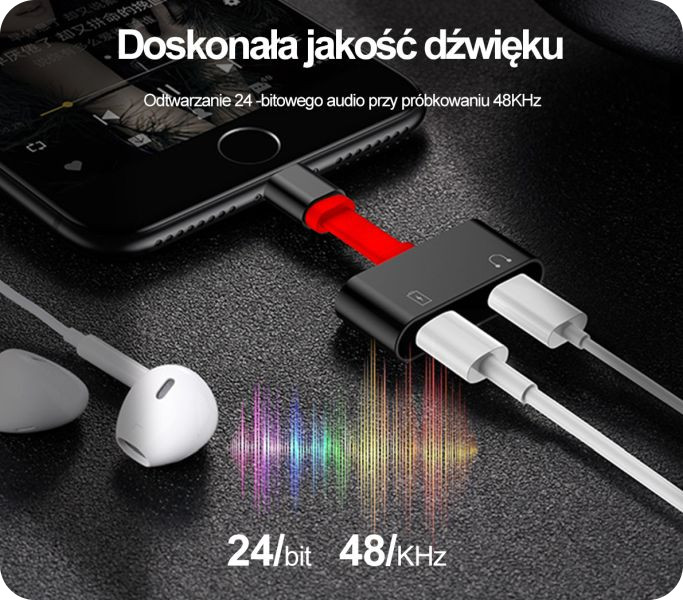 Przejściówka spełnia standardy firmy Apple w zakresie jakości dźwięku, umożliwia odtwarzanie 24 -bitowego audio przy próbkowaniu 48KHz. Dźwięk na wyjściu otrzymujesz taki jakbyś z przejściówki nie korzystał. Przejściówka umożliwia szybkie ładowanie prądem 5V 2A.