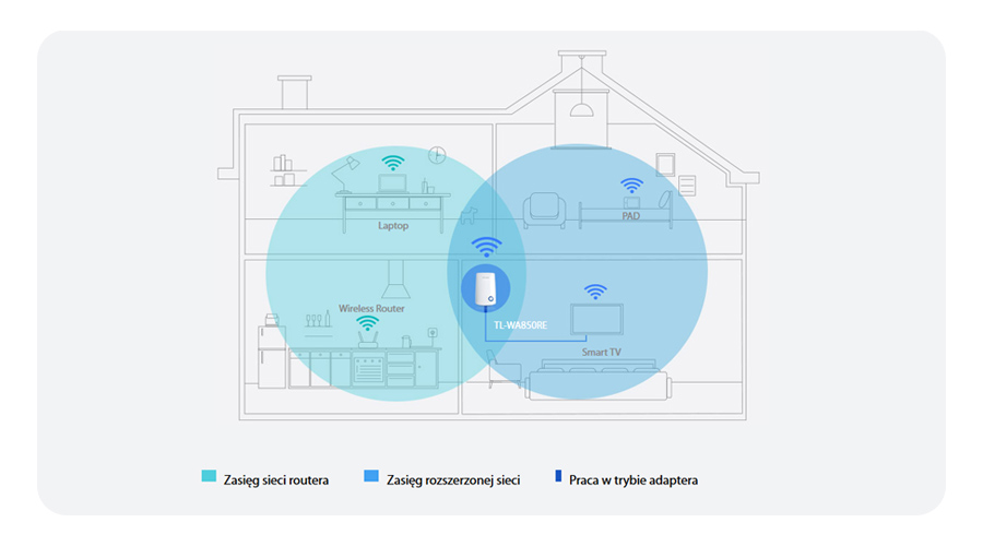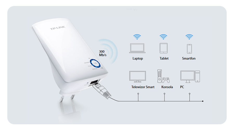 Pojedynczy port Ethernet wzmacniacza TL-WA850RE pozwala na wykorzystanie urządzenia jako karty sieciowej, umożliwiającej podłączenie z siecią bezprzewodową przewodowych urządzeń sieciowych, takich jak odtwarzacze Blu-ray®, konsole do gier oraz dekodery cyfrowej telewizji. Jednocześnie urządzenie wzmacnia sygnał bezprzewodowej sieci.