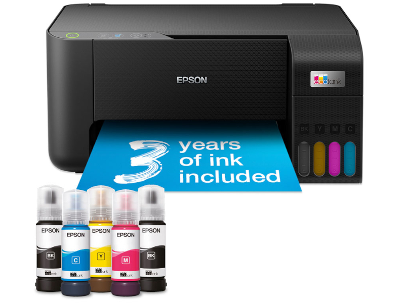 Drukarki Epson EcoTank zapewniają wygodne i bezproblemowe drukowanie w domu. Duże pojemniki na atrament można uzupełniać szybko i czysto, bez niepotrzebnego bałaganu. Specjalne butelki z blokadą gwarantują, że każdy kolor trafi wyłącznie do właściwego zbiornika, eliminując ryzyko pomyłek. Przejrzysty wskaźnik poziomu atramentu z przodu urządzenia pozwala w każdej chwili sprawdzić, kiedy konieczne jest uzupełnienie tuszu. To praktyczne i oszczędne rozwiązanie, które sprawia, że domowe drukowanie staje się proste, komfortowe i bezstresowe.