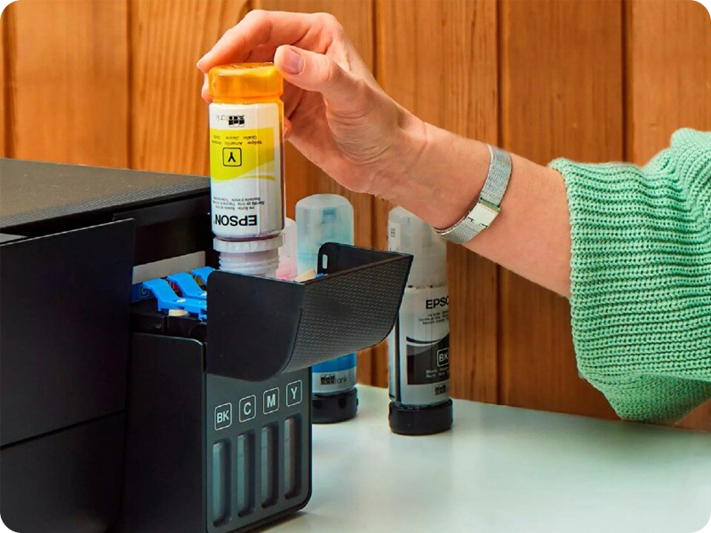 Zastosowany system stałego zasilania atramentem (CISS) to rozwiązanie nastawione na ekonomiczne drukowanie i łatwą kontrolę tuszu. Wbudowany skaner o rozdzielczości do 1200 x 600 dpi pozwala szybko digitalizować dokumenty w formacie A4. Skanowanie trwa do 11 sekund, co jest wystarczające do sprawnej pracy biurowej. Podajnik papieru mieszczący 100 arkuszy oraz pojedyncza tacka upraszczają obsługę urządzenia. Interfejs USB zapewnia stabilne i proste połączenie z komputerem, bez zbędnych komplikacji.