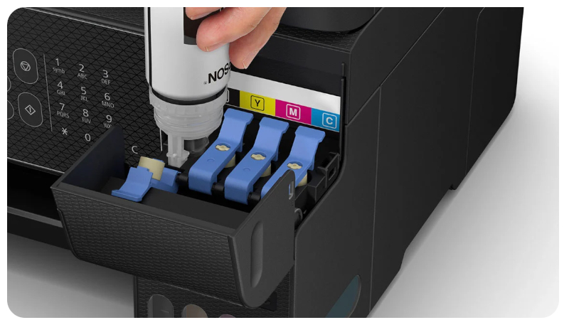 EcoTank to rozwiązanie stworzone z myślą o bezproblemowym drukowaniu zarówno w domu, jak i w małym biurze. System pojemników na atrament o dużej pojemności zapewnia długą, nieprzerwaną pracę oraz wyjątkową wygodę użytkowania. Uzupełnianie atramentu jest szybkie, czyste i intuicyjne — specjalnie zaprojektowane butelki z blokadą umożliwiają wlanie tuszu wyłącznie do właściwego pojemnika, eliminując ryzyko pomyłek i zabrudzeń. To inteligentne rozwiązanie, które gwarantuje komfort, oszczędność i pełną kontrolę nad drukowaniem.