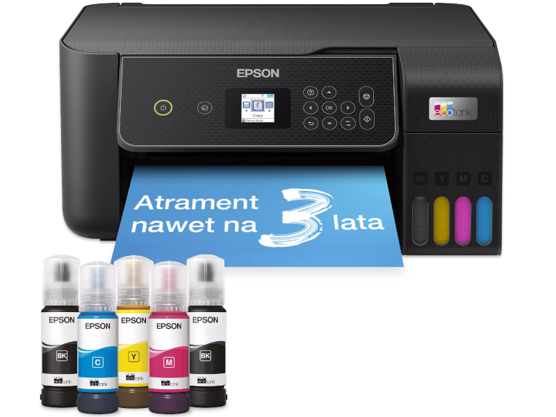 Drukarki EcoTank to rozwiązanie stworzone z myślą o bezproblemowym drukowaniu w domu i małym biurze. Pojemniki na atrament o dużej pojemności można uzupełniać szybko i bez bałaganu, a butelki z blokadą kolorów gwarantują, że każdy atrament trafi wyłącznie do właściwego pojemnika — koniec pomyłek i zabrudzeń. To urządzenie ekonomiczne w eksploatacji, pozwalające zaoszczędzić nawet 90% na kosztach druku. W zestawie znajduje się atrament, który może wystarczyć nawet na 3 lata, umożliwiając wydruk do 8100 stron w czerni i 6500 stron w kolorze. Zamienne butelki atramentu odpowiadają aż 66 tradycyjnym kartridżom, co oznacza rzadszą wymianę i większą wygodę w codziennym użytkowaniu. EcoTank to inteligentny wybór dla osób ceniących oszczędność, wygodę i wysoką jakość wydruków każdego dnia.