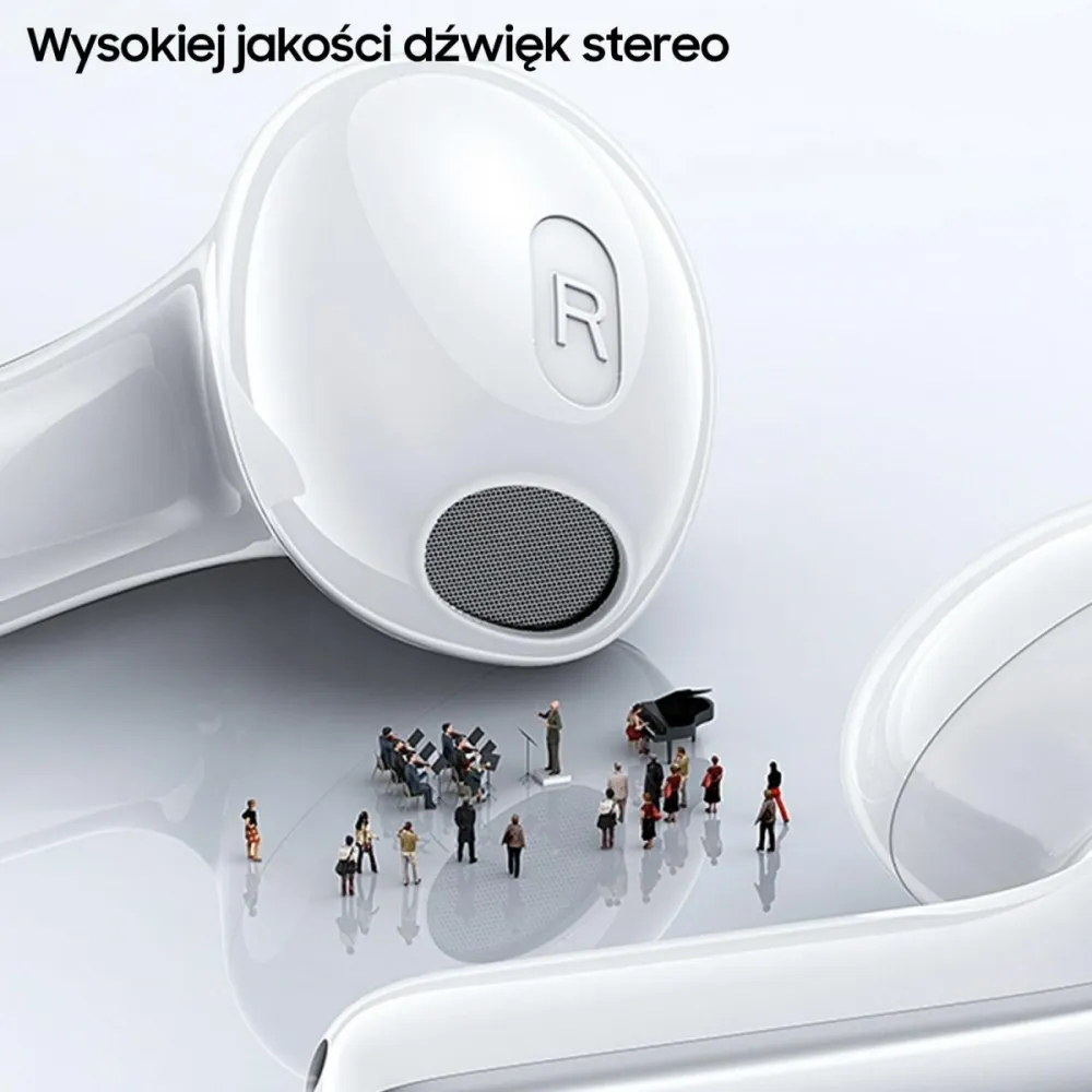 Ulepszone sterowanie dotykowe, ładowanie bezprzewodowe słuchawek i etui, szybkie i stabilne połączenie, rozmowy HD, stabilna transmisja. Zestaw ponadto zawiera dedykowane etui, które działa jak power bank o pojemności 300mAh.