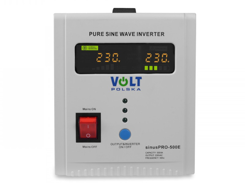 Zasilacz awaryjny Volt Polska SINUS PRO 500 E 12V jest urządzeniem do bezprzerwowego zasilania m.in.: instalacji centralnego ogrzewania (piece CO, pompy, sterowniki, podajniki etc.), komputerów, serwerów, zestawów komputerowych, bram automatycznych, urządzeń automatyki, elektronarzędzi itp. W przypadku zaniku napięcia sieciowego 230VAC, urządzenie przełącza się w tryb pracy akumulatorowej pozwalając na dalsze bezprzerwowe działanie systemu i zabezpieczając przed uszkodzeniem instalacji, bezpowrotną utratą danych.