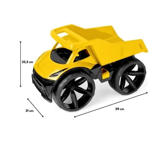 MAXIMUS to duża wywrotka w kolorze soczystej czerwieni, która wyróżnia się: nowoczesnym designem, solidną lekką konstrukcją, nowoczesną linią nadwozia z dużymi matowymi kołami oraz pięknym wykończeniem detali. Dodatkowo posiada ruchomy otwierany kiper oraz wygodny uchwyt co pozwala na urozmaiconą i realistyczna zabawę, można wykorzystywać go do przewożenia piasku lub innych zabawek. Pojazd ma 59 cm długości.