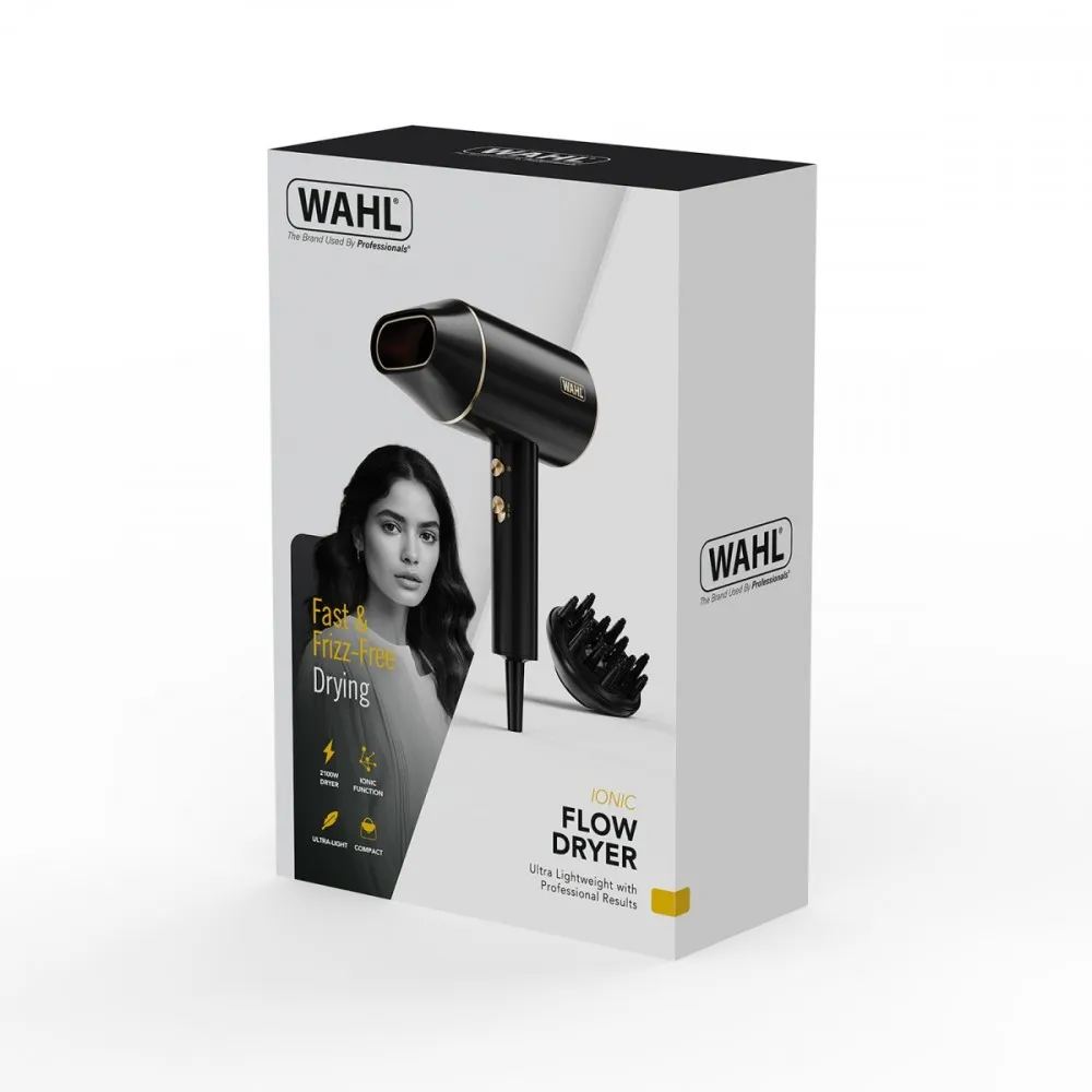 Suszarka do włosów Wahl Ionic Flow łączy moc i lekkość, umożliwiając łatwe i komfortowe stylizowanie we własnym domu.
