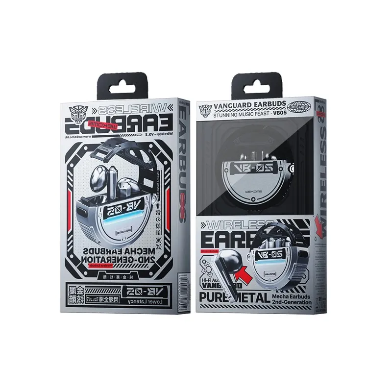 Bezprzewodowe słuchawki dokanałowe WEKOME VB05 True Wireless z podświetlanym etui ładującym Mecha. Słuchawki wykorzystują nową wersję technologii bezprzewodowej Bluetooth 5.3, która zmniejsza opóźnienia, zakłócenia i poprawia żywotność baterii. Druga generacja słuchawek VB05 Vanguard Series oferuje tym samym jeszcze lepszy dźwięk oraz czas odtwarzania muzyki do 4,5 godziny na jednym ładowaniu.
