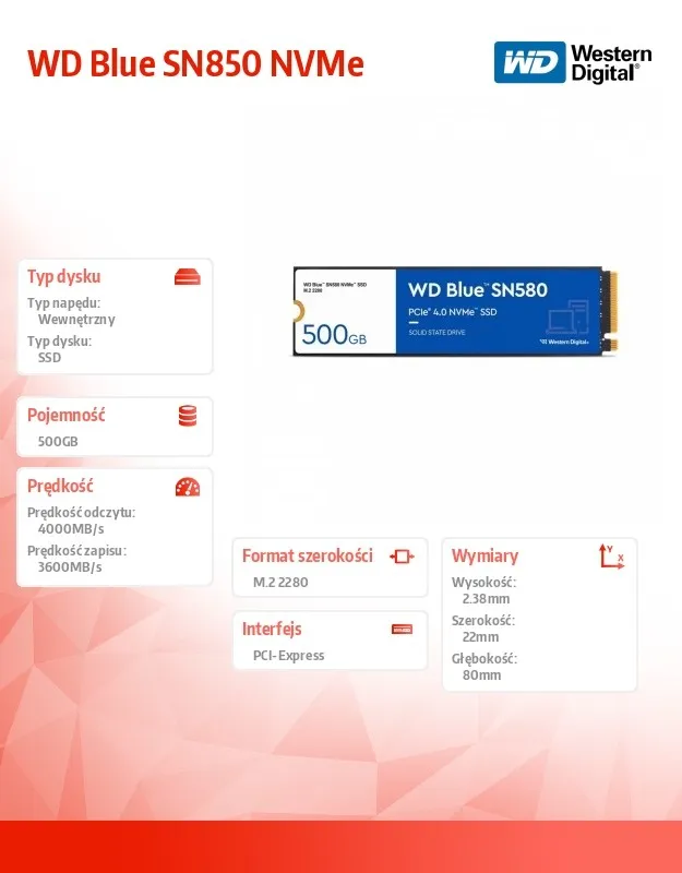 Rozbudź swoją wyobraźnię dzięki dyskowi SSD WD Blue SN580 NVMe z technologią PCIe Gen 4.0 dla twórców i profesjonalistów. Zwiększ produktywność i kreatywność, wybierając dyski SSD z technologią PCIe Gen 4.0 zapewniające prędkość odczytu do 4150 MB/s (modele 1 TB i 2 TB). Dzięki pojemności do 2 TB i konstrukcji M.2 2280 typu slim na jednym dysku można przechowywać aplikacje, dane i multimedia, takie jak zdjęcia, filmy 4K i muzykę. Twórz bez żadnych przerw w terenie lub w podróży dzięki magazynowi danych o niskim zużyciu energii, który pozwala maksymalnie wydłużyć czas pracy baterii laptopa.